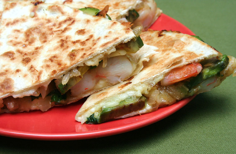 Avocado, Shrimp, and Caramelized Onion Quesadillas
