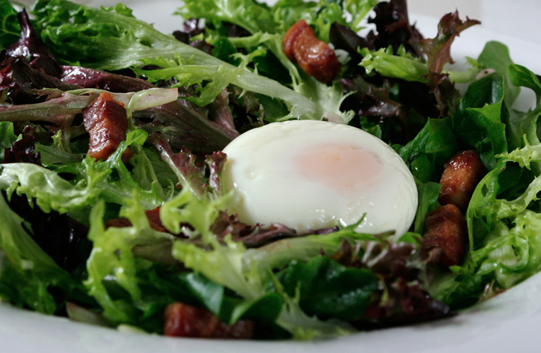 By Marge Perry and David Bonom. The beauty of this classic bistro salad is the way the poached egg yolk oozes over the greens, cloaking them with rich flavour. Lardons, the bits of chopped slab bacon, provide a salty, meaty contrast. If you can’t find slab bacon, substitute 8 slices of ordinary bacon.