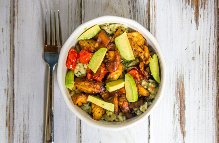 By Nicole Cook. It’s like a BLT in a bowl this easy-to-make rice bowl is filled with bacon, grilled chicken and avocado and tossed with a zesty pesto ranch dressing.
