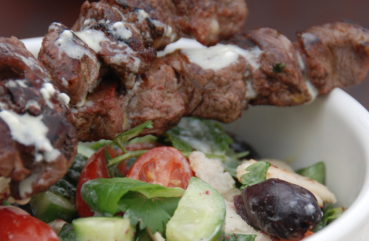 - Just before serving, whisk or blend the dressing ingredients together, add the bread to the salad and toss with half the dressing. Place in bowls or large cups. Top with the skewers and drizzle with the remaining dressing.