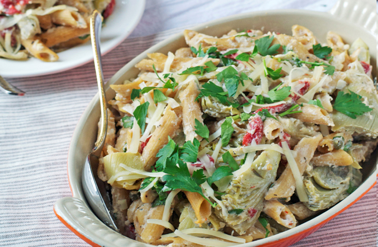By Erin Clarke. Headnote: A luscious, creamy pasta that’s easy to make and good for you too! The secret is light ricotta cheese, which creates a rich-tasting sauce that is surprisingly low in calories. Made with whole wheat pasta, bright roasted bell peppers, and artichokes, this healthy 20-minute meal is sure to be your new weeknight favourite!