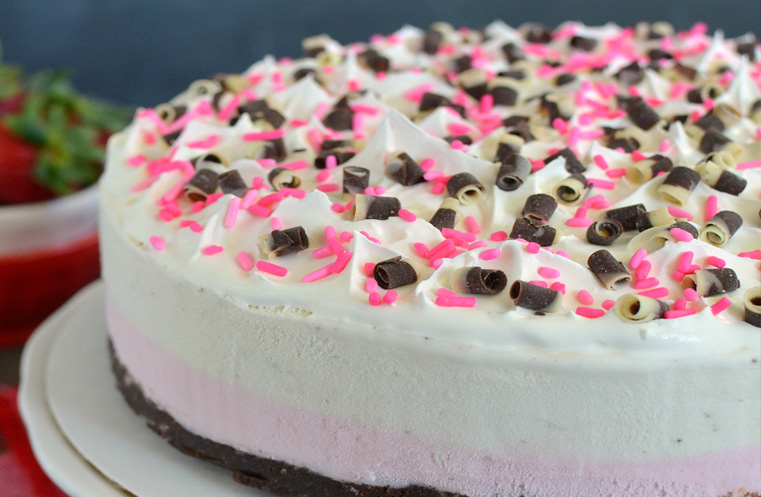 - Place the strawberry ice cream on the counter for 15 minutes. Stir until it is spreadable but not melted. Spoon it onto the brownie crust. Place in the freezer for 30 minutes. Repeat with the vanilla ice cream. Spoon and spread over the strawberry ice cream layer. Freeze completely.