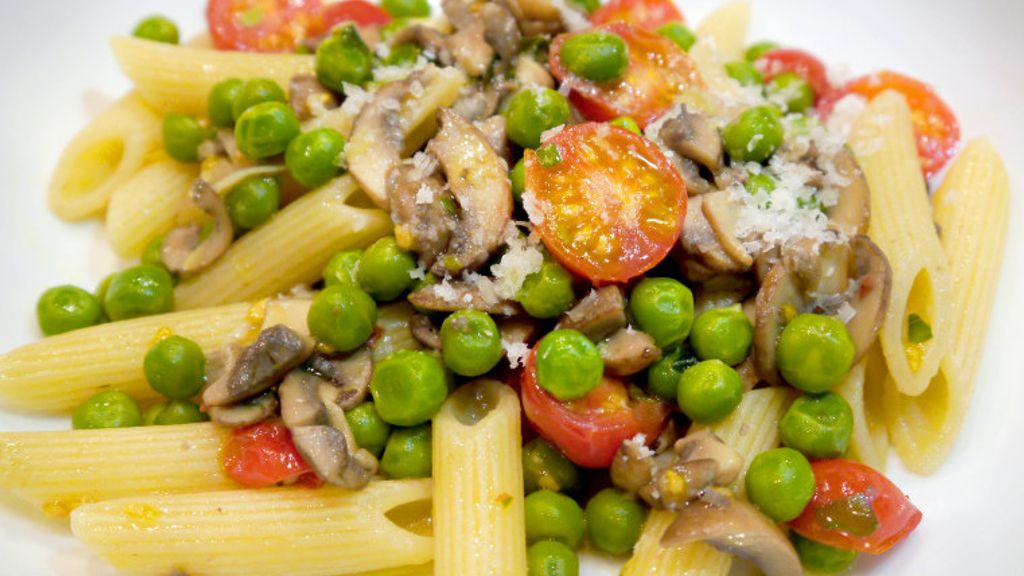 Penne with Mushrooms, Peas & Cherry Tomatoes