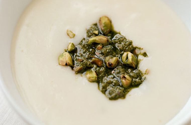- Return to saucepan to reheat. Spoon soup into bowls, top with the pesto, and give a light swirl with a spoon. Scatter with a few of the extra pistachios.